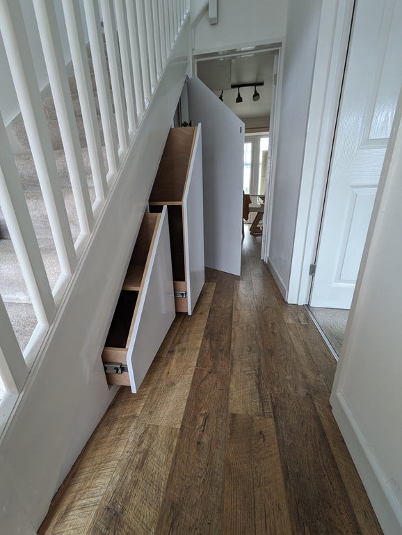 "We could not be happier with the work Sam did for us transforming the cupboard under the stairs. As well as being incredibly useful and a much more efficient way of for storing our shoes, bags and other stuff, it also just looks so much better than what we had before; it really makes a difference to the hallway. He took the time to listen to what we had in mind, made some good suggestions about the various options we had (and their associated costs), and then kept us informed once he had finalised the design. While he was installing everything, he was extremely tidy and left the house looking immaculate, which was definitely appreciated with us working from home and having a toddler in the house! We would definitely have Sam back to do other projects for us, and have recommended him to number of our friends already."